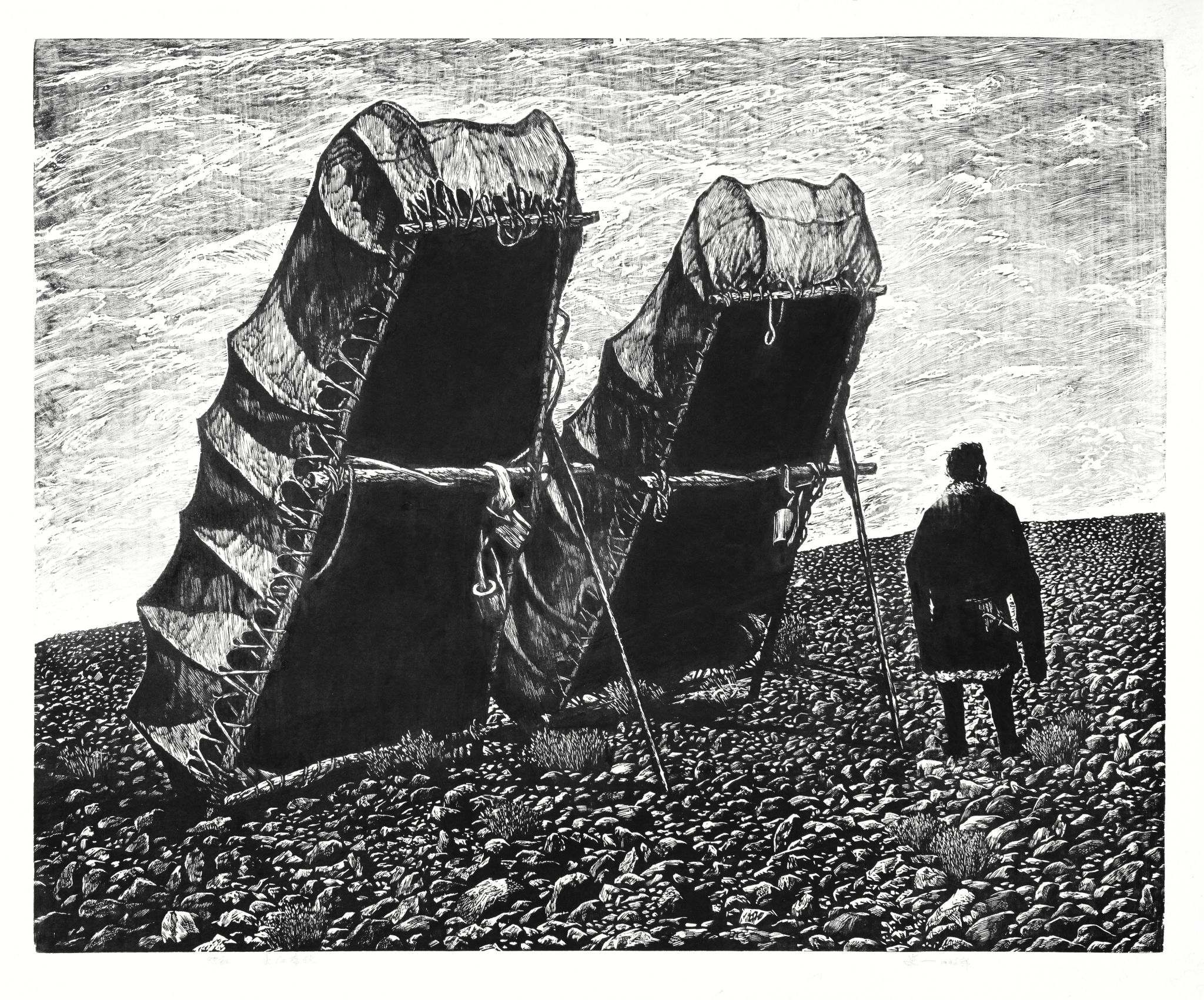 《孤独》黑白木刻60x70(cm)李小明2002年