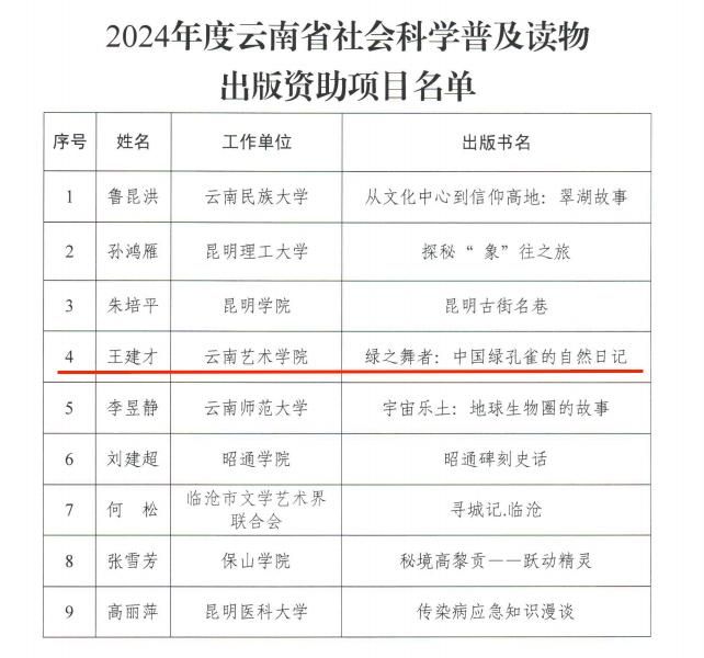 5月7日,云南省社会科学界联合会公布了2024年度2024年度云南省社会科学普及读物出版资助项目名单。全省共批准9项,我校王建才教授申报的《绿之舞者:中国绿孔雀的自然日记》获批立项。