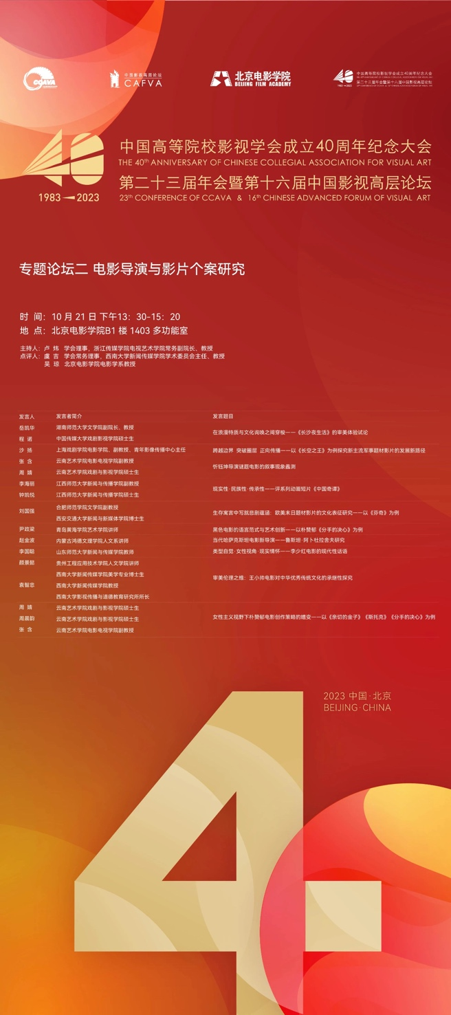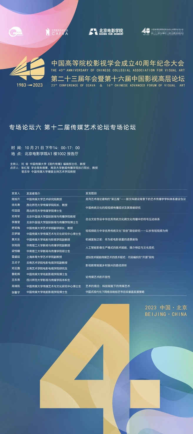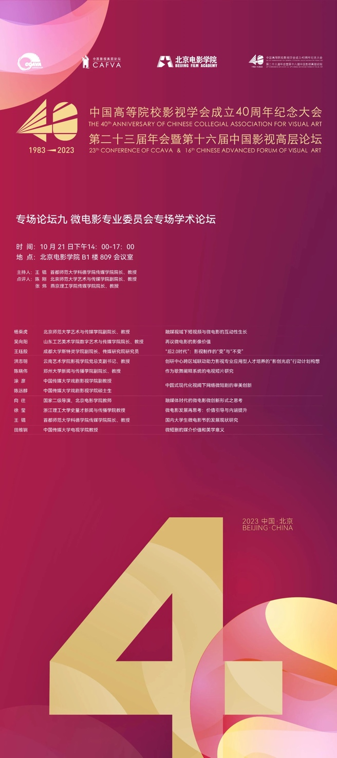 光影闪耀,华章绽放,梦想绵延。2023年10月20日-22日,中国高等院校影视学会成立40周年纪念大会、第二十三届年会暨第十六届中国影视高层论坛于北京电影学院怀柔校区荣耀盛大开幕。来自全国高校近800名影视学者会聚一堂,围绕“现代化与高质量:中国影视教育的发展历史、经验及趋势”这一主题展开深入研讨,全面梳理学会发展历程,总结学会发展成就,展望中国影视教育发展趋势。