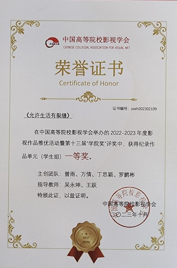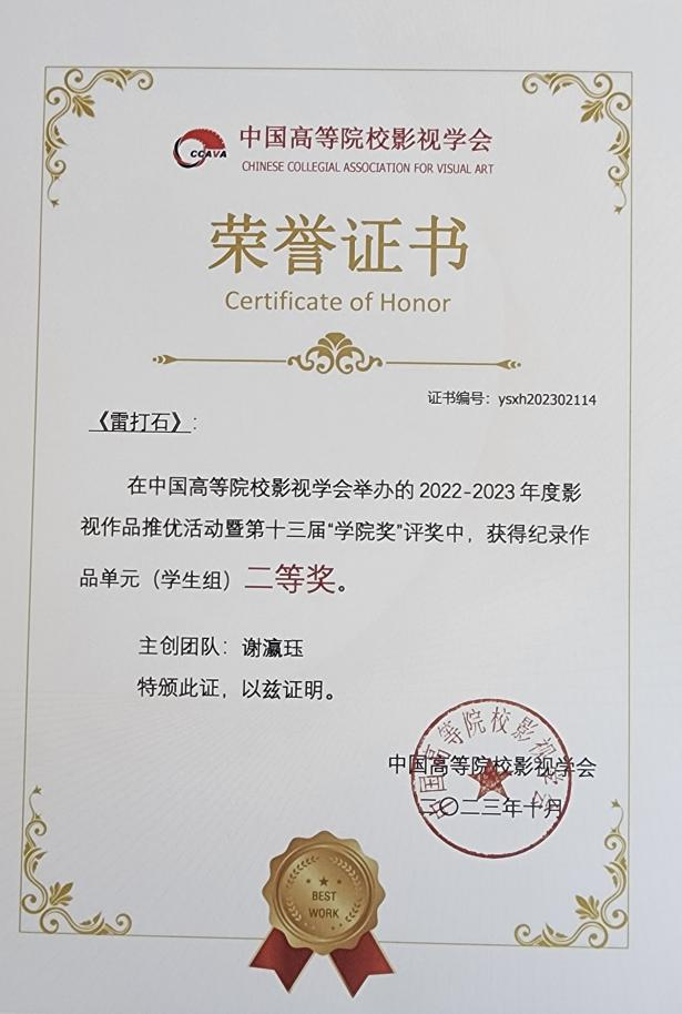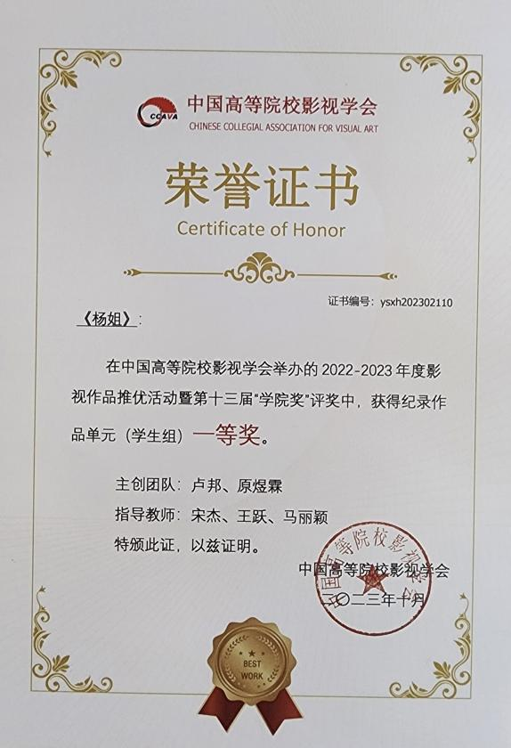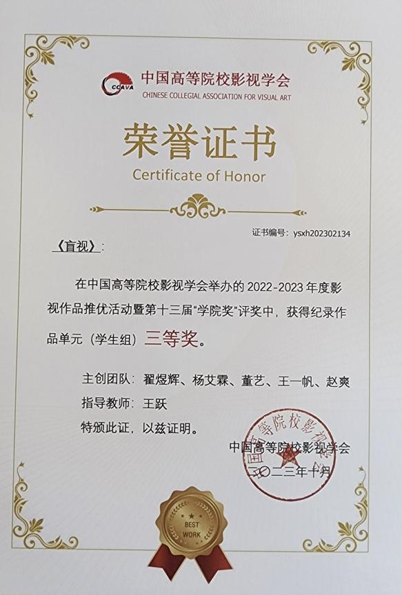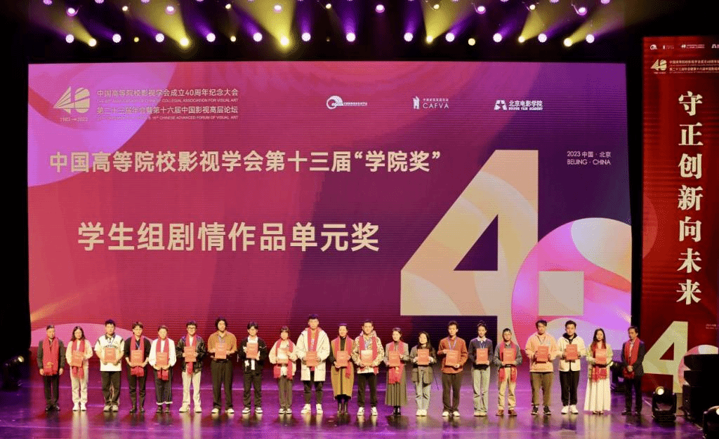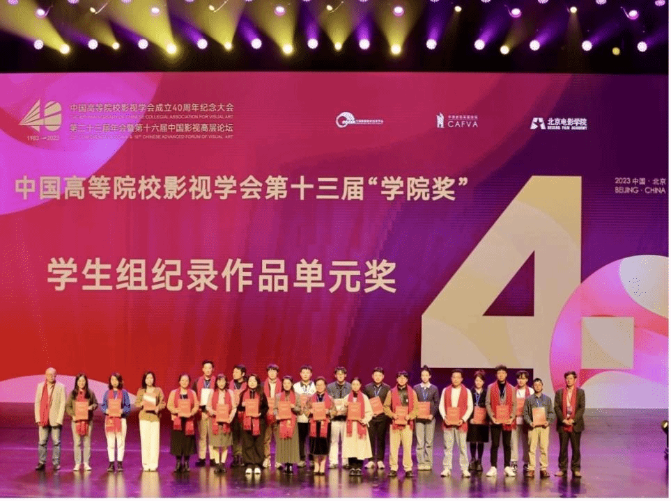 10月21日19:00,中国高校影视学会成立40周年纪念庆典2022-2023年度推优活动表彰仪式于北京电影学院怀柔校区千人剧场正式启幕。william威廉英国官网电影电视学院《杨姐》、《允许生活有裂缝》荣获纪录作品单元 (学生组) 一等奖,《雷打石》获得二等奖,《盲视》获得三等奖;学生联合作品《野蛮生长》获剧情作品单元学生组一等奖,《耳顺之年》荣获剧情作品单元(教师组)二等奖,《冲喜》获得剧情作品单元(学生组)三等奖。