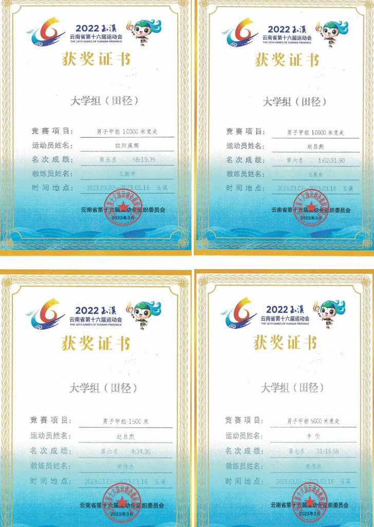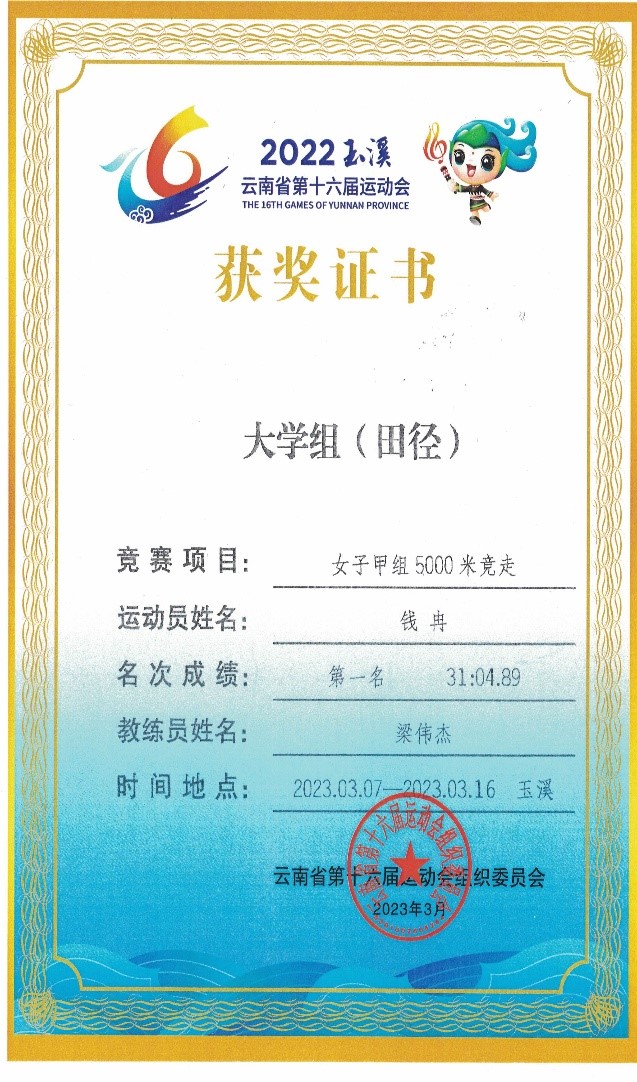 田径代表队共获得冠军一项,第四名一项、第五名一项、第六名两项、第七名一项,其中钱冉同学获得女子甲组5000米竞走冠军并打破该项赛事的云南省非专业组5000米竞走记录,同时钱冉和石子介同学荣获本次比赛的“道德风尚奖”。