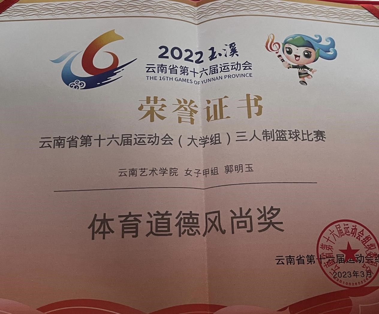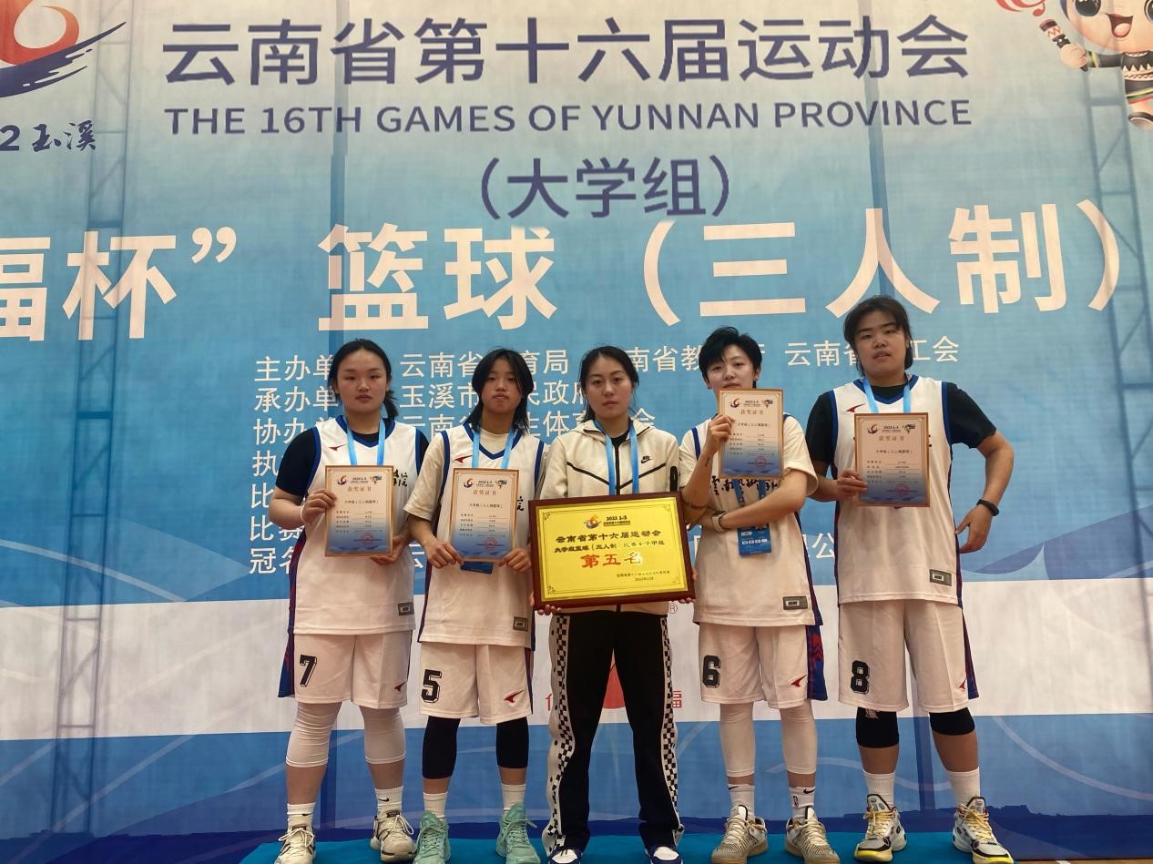 在女子三人篮球比赛中,我校代表队战胜了云南财经大学、云南农业大学、william威廉英国官网文华学院获得了女子甲组第5名的成绩,其中郭明玉同学获得了本次比赛的“体育道德风尚奖”