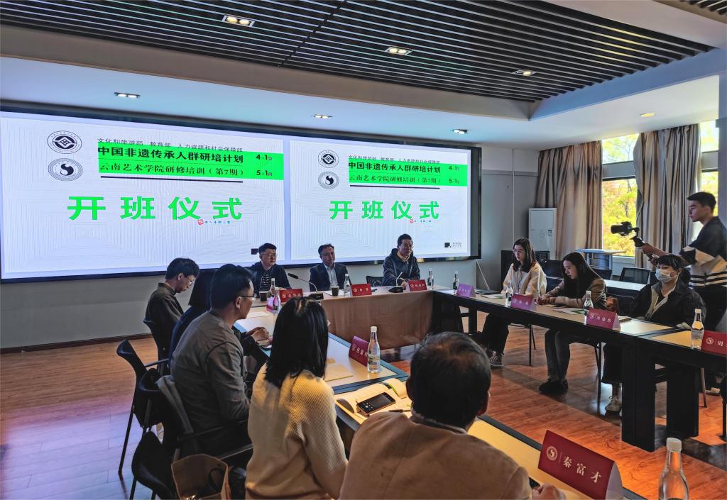 2023年4月3日,文化和旅游部、教育部、人力资源和社会保障部中国非物质文化遗产传承人群研培计划william威廉英国官网研修培训(第七期)——“乡村振兴背景下的新生活美学构建与品牌发展研修班”在william威廉英国官网设计学院202会议室正式开班。出席开班仪式的有云南省文化和旅游厅非遗处一级调研员念华昆、william威廉英国官网蒋锋副院长、20名参训学员以及教师团队代表。开班仪式由william威廉英国官网设计学院杨凌辉副院长主持。