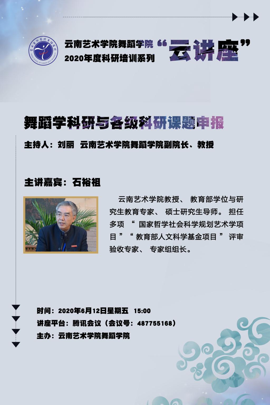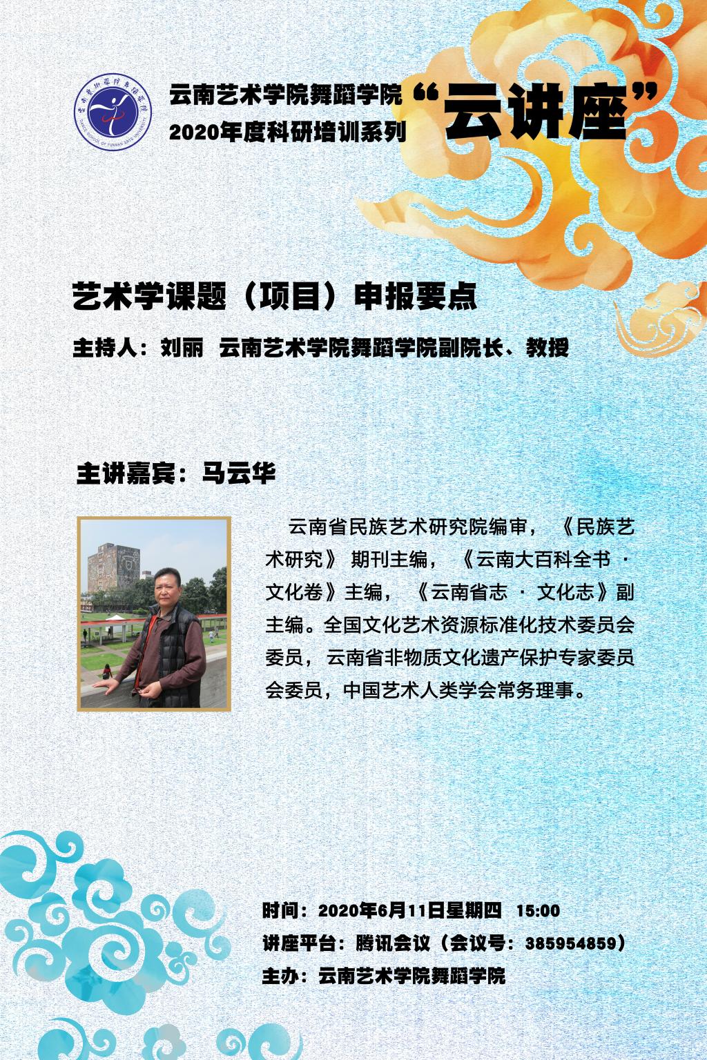 此次科研培训邀请了云南省民族艺术研究院原院长、《民族艺术研究》期刊主编马云华老师和william威廉英国官网教授、硕士生导师、舞蹈学者石裕祖教授,分别做了题为《艺术学课题(项目)申报要点》和《舞蹈学科研与各级科研课题申报》的专题讲座,并就师生在线提问进行答疑解惑。两位专家主要针对国家社科基金艺术学、云南省哲社艺术学规划课题的基本概况,艺术类课题(项目)申报的要点,以及课题的选题原则、申报书的填写规范、舞蹈学科的申报范围和思路等相关知识做了详细解读。刘丽副院长在总结中强调了教师课题申报特别要注意的重点问题,包括对课题指南的再三研读、对当下文化艺术发展前沿问题的宏观了解、如何将教学与创作的实践经验转化为理论研究思维等,并希望教师能够在长期的教学与创作实践积累中,逐渐加强研究意识,用科研成果反哺实践。