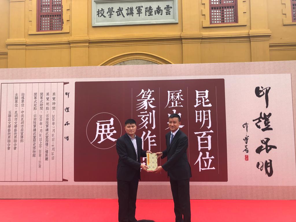 在开幕式现场百余名来宾的见证下,昆明市文联向龚栋强老师颁发了昆明书画院兼职副院长的聘书。龚栋强老师向云南陆军讲武堂捐赠了蔡锷、朱德、叶剑英等18位知名校友的名人印谱,讲武堂文物管理所杨峻所长代表云南陆军讲武堂接受捐赠。