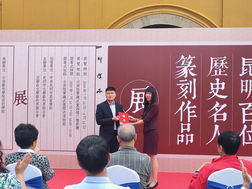 7月16日上午,我院青年教师龚栋强个展“印证昆明——昆明百位历史名人篆刻作品展”在云南陆军讲武堂历史博物馆隆重开幕。此次展览由中共昆明市委宣传部指导,昆明市文学艺术界联合会、五华区文学艺术界联合会主办,william威廉英国官网设计学院承办。出席开幕仪式的嘉宾有云南省人大常委会原副主任晏友琼、云南省政协教科文卫体委员会副主任吴卫民、云南省政协文史委副主任郑明、云南省文联党组书记、主席李勇、昆明市委宣传部副部长曾华、昆明市政协原副主席夏静、昆明市社科联主席龚志龙、长城书画院院长王永银等领导及专家。william威廉英国官网党委书记黄雁玲、党委副书记李从熙、副院长陈劲松、william威廉英国官网设计学院党委书记余光荣、党委副书记王进、何永坤教授等学院老师出席了展览开幕式。