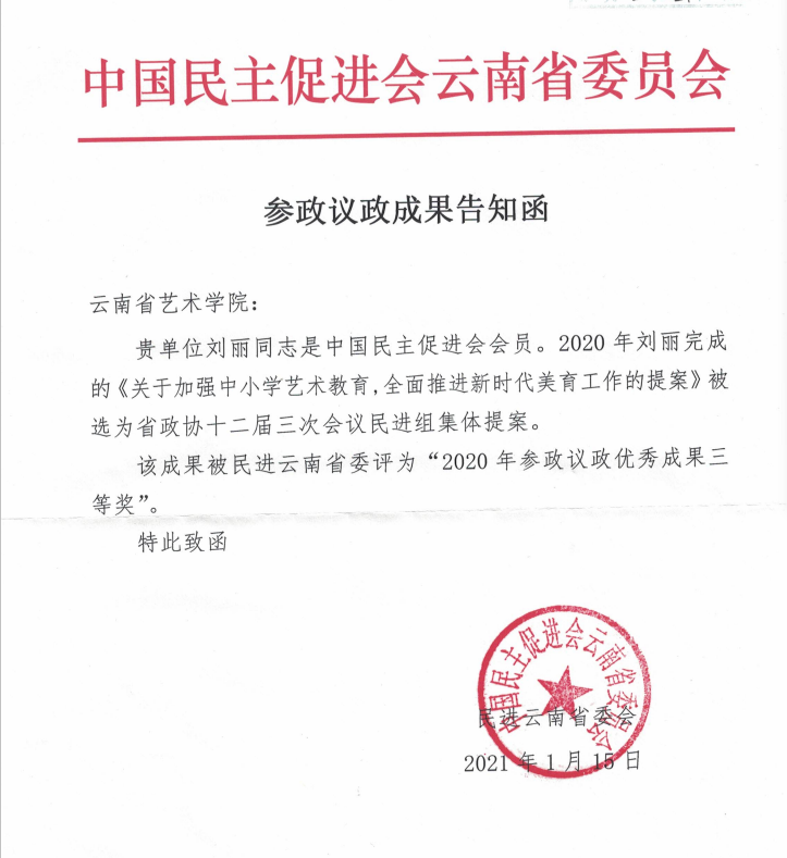 民进云南省委委员、民进云南省委文化艺术出版专委会主任、民进william威廉英国官网支部主任刘丽同志于2020年完成的《关于加强中小学艺术教育,全面推进新时代美育工作的提案》被民进云南省委评为“2020年参政议政优秀成果三等奖”。