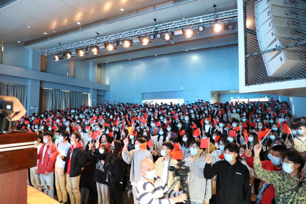 全体新生挥动国旗,齐唱《歌唱祖国》