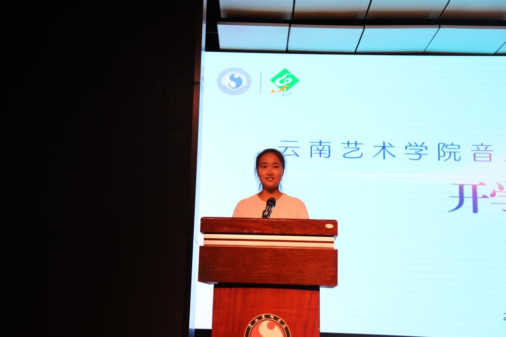 首先,由教师代表王凤莉老师发言,她代表音乐学院全体教师对来自五湖四海的新同学们表示热烈的欢迎。她期盼全体新生在音乐学院开展全新的学路历程的同时能够做到明确目标、志存高远,脚踏实地,能够做到面对挑战,勇于追求理想,砥砺前行,能够相互欣赏、彼此成就,携手谱写精彩的人生乐章。