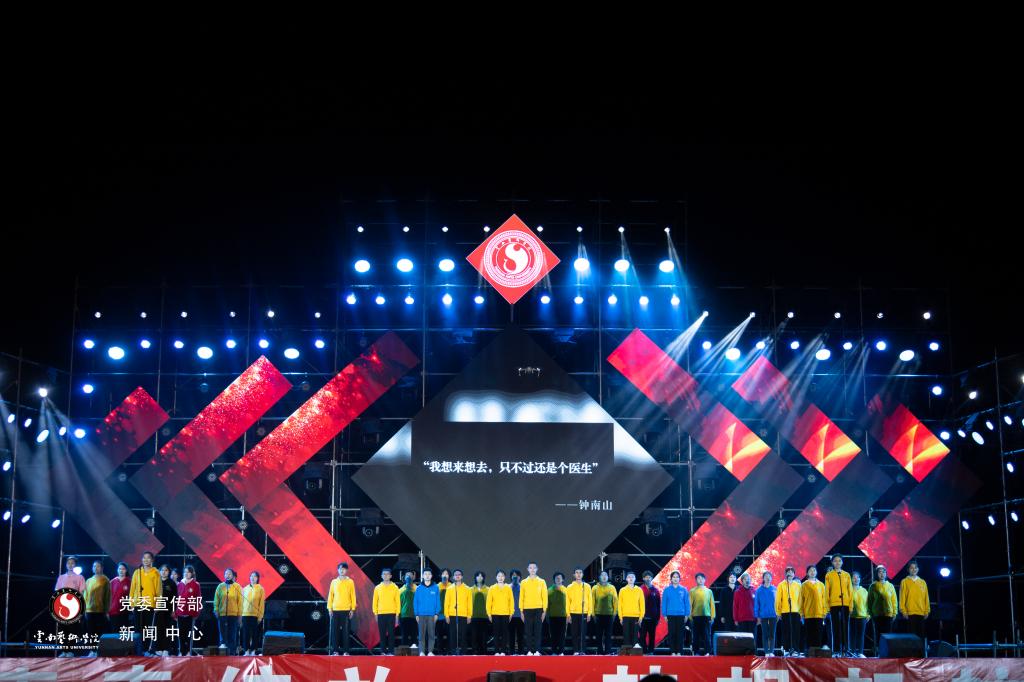 19:00,开学典礼正式开始,全体起立高唱《中华人民共和国国歌》,高昂清亮的歌声响彻云霄,激扬起每一位2020级新生对大学生活的憧憬与向往。