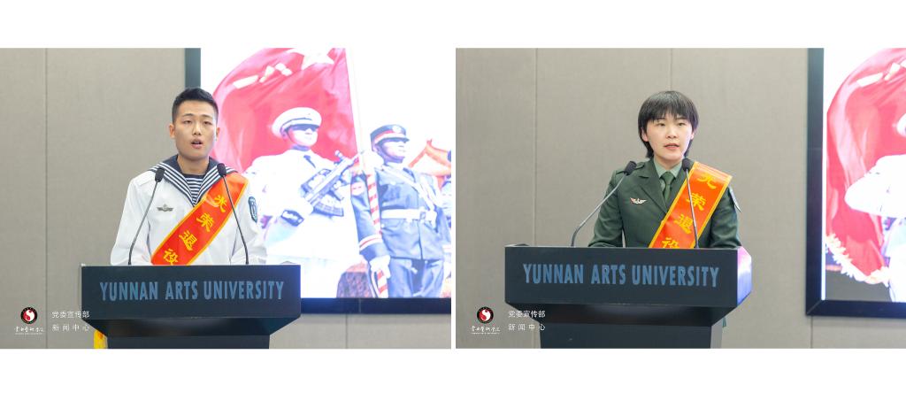 音乐学院退役学生代表张其燃(2018年9月应征入伍,2020年9月退役返校,服役于原中国人民解放军海军91206部队。)向各位领导、老师致以最诚挚的敬意和最衷心的感谢。通过分享自己参军以来的心路历程及军旅生涯,表示在今后的学习生活中,会继续保持军人的信念和勇敢、发扬军人本色,为学校的建设与发展做出自己应有的贡献,做到无愧于曾经的军装,无愧于青春。
