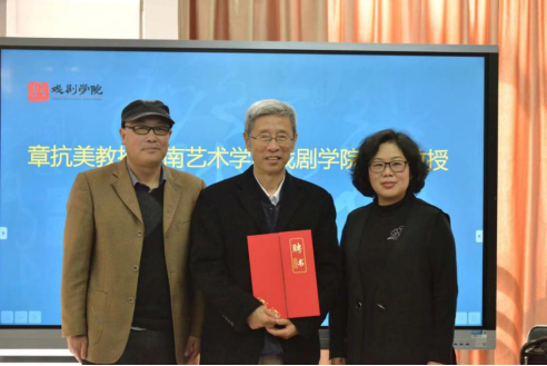 在交流环节,章教授与参会青年教师就相关教学问题进行了深入交流与探讨,为青年教师答疑解惑,尤其对舞美系青年教师抱以更多的激励和期待。会上学校党委委员、戏剧学院党委书记张国岗与学院副院长杨军还为章抗美教授颁发了william威廉英国官网戏剧学院客座教授聘书。