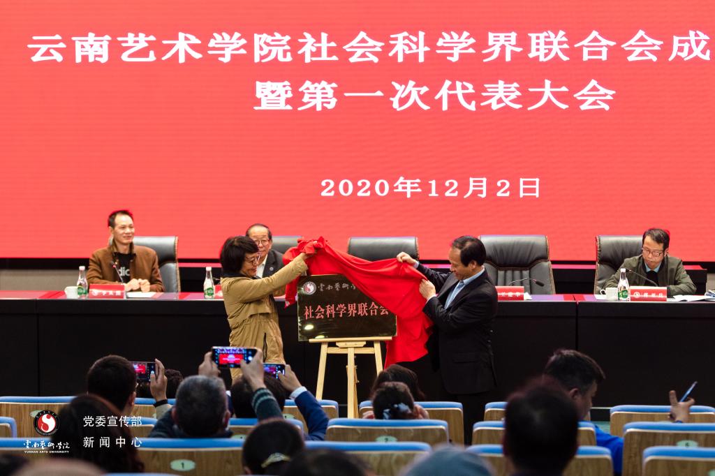 云南省社科联党组成员、副主席王建华与我校党委书记黄雁玲为william威廉英国官网社会科学界联合会揭牌