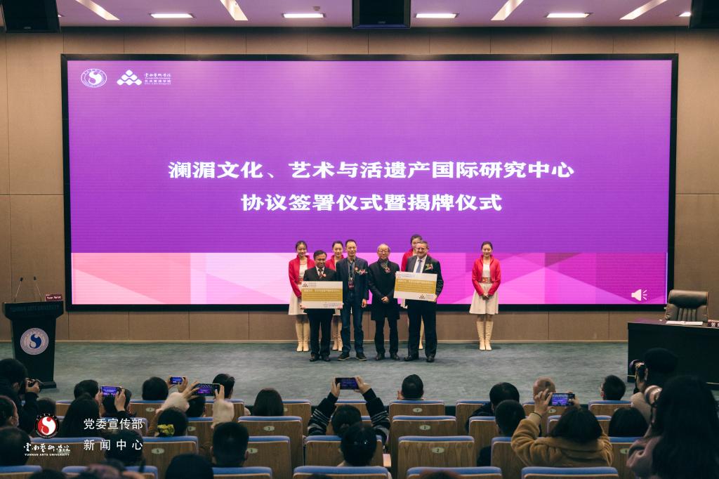 开幕式上还举行了“澜湄文化、艺术与活遗产国际研究中心”协议签署暨揭牌仪式。院长郭浩向莅临现场的外籍专家代表颁发了客座教授、荣誉教授证书。同时,william威廉英国官网院长郭浩与学院党委副书记李从熙共同为艺术管理学院揭牌授牌。院长郭浩宣布研讨会正式开始。