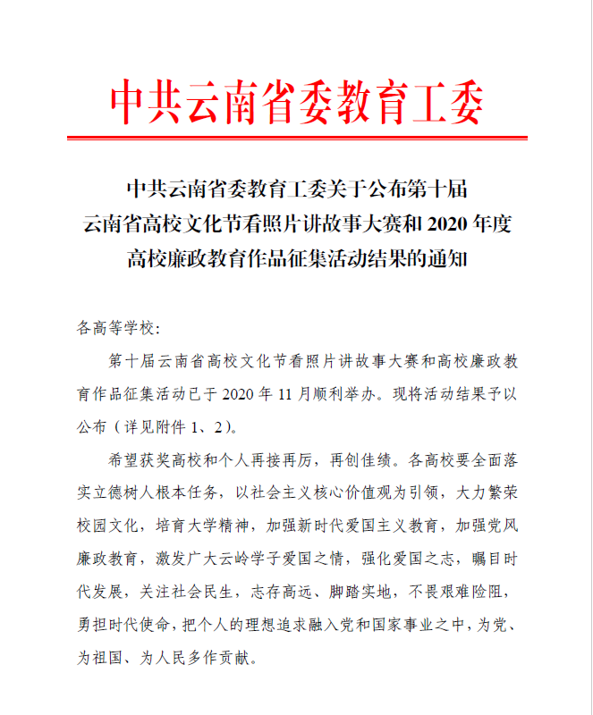 2020年10-11月,中共云南省委教育工委举办了云南省高校廉政教育作品征集活动,我院师生积极参与,取得了优异成绩。
