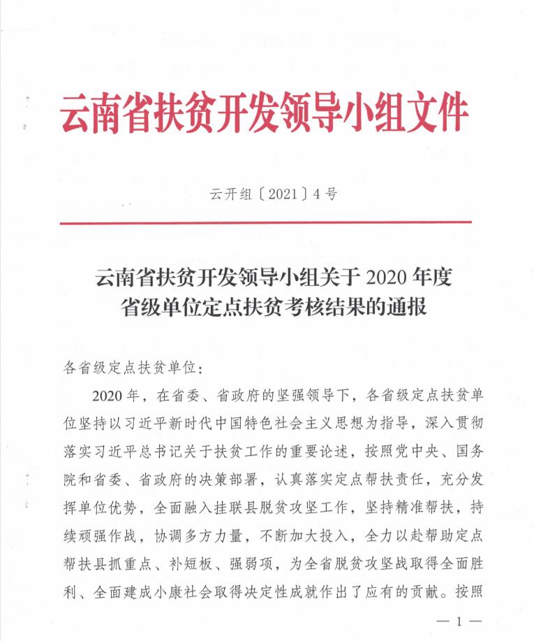 根据云南省扶贫开发领导小组2021年4月28日印发的《云南省扶贫开发领导小组关于2020年度省级单位定点扶贫考核结果的通报》(云开组【2021】4号),我校在2020年度省级单位定点扶贫考核结果中获评“好”等次。我校将始终把习近平新时代中国特色社会主义思想作为各项工作的根本遵循,按照党中央、国务院和省委、省政府决策部署,认真总结借鉴脱贫攻坚经验,深入研究全面推进乡村振兴帮扶机制,坚持和完善定点帮扶工作,严格落实“四个不摘”要求,狠抓责任和工作落实,下大力气做好后续帮扶,坚决把来之不易的脱贫攻坚成果巩固住、拓展好,接续巩固拓展脱贫攻坚成果同乡村振兴有效衔接,把具体工作举措全面衔接到乡村振兴上来,持续支持定点帮扶县全面推进乡村振兴,推动脱贫地区经济社会发展和脱贫群众生产生活改善,以优异成绩庆祝建党100周年。