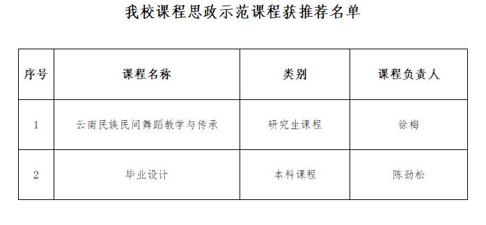 根据《教育部办公厅关于开展课程思政示范项目建设工作的通知》(教高厅函〔2021〕11号)要求,按照云南省教育厅的安排部署,我校认真推进建设工作。近期,教育厅对“普通本科课程思政示范建设项目推荐名单”,以及“研究生课程思政示范课程建设立项推荐名单”进行了公示。云南省教育厅向教育部推荐的6门本科课程中,我校本科课程——《毕业设计》入选;向教育部推荐的2门研究生课程中,我校研究生课程——《云南民族民间舞蹈教学与传承》入选。