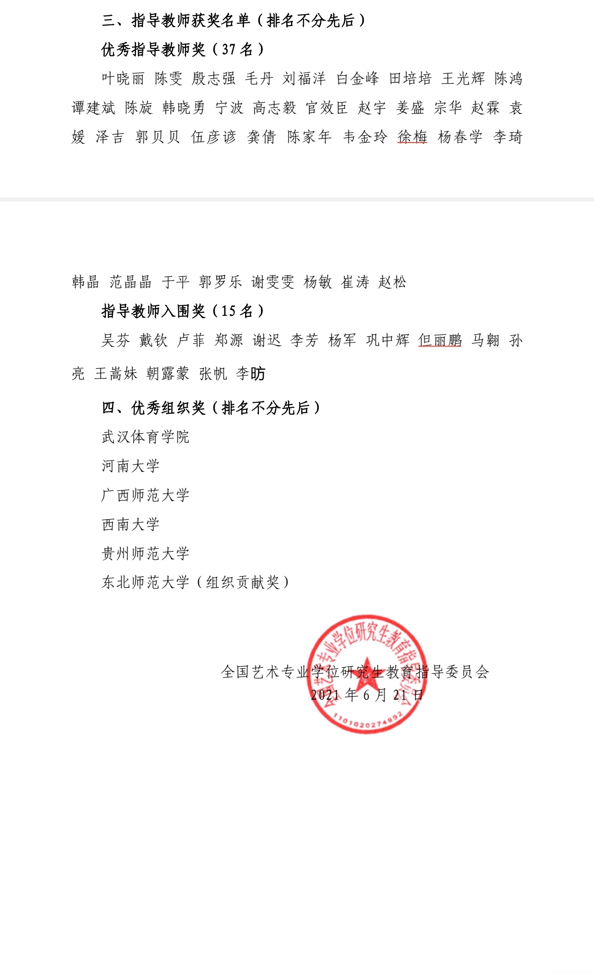 来自全国艺术硕士研究生舞蹈领域培养院校的学科带头人、舞蹈领域专家对参赛作品进行了客观、公正的评审,我院《花腰女·花腰乐》荣获展演活动“表演奖”,硕士生导师徐梅教授荣获“优秀指导教师奖”,《路灯》指导教师但丽鹏副教授荣获“指导教师入围奖”。