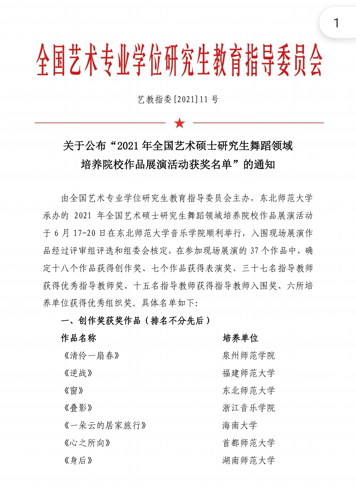 由全国艺术专业学位研究生教育指导委员会主办,东北师范大学承办的“2021年全国艺术硕士研究生舞蹈领域培养院校作品展演活动”,于2021年6月17—20日在东北师范大学音乐学院顺利举行。我校舞蹈学院学位点选送的硕士研究生舞蹈作品《花腰女·花腰乐》《路灯》分别入围,并参加表演组和创作组的现场展演,荣获佳绩!