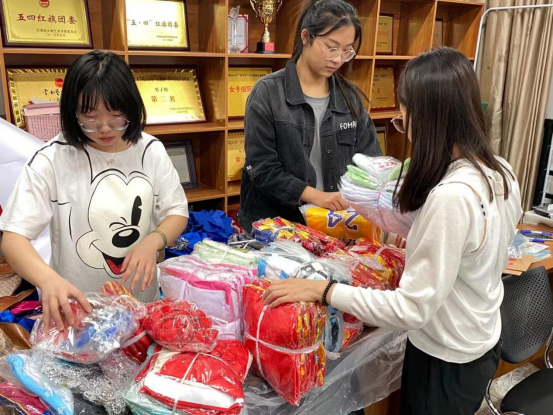 捐赠物品收集完后,音乐学院青年志愿者协会成员打包并整理衣物、乐器等