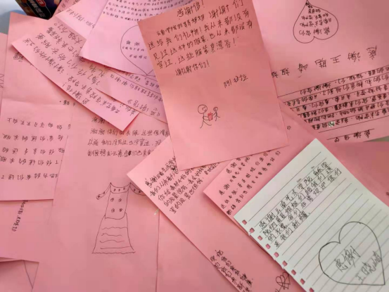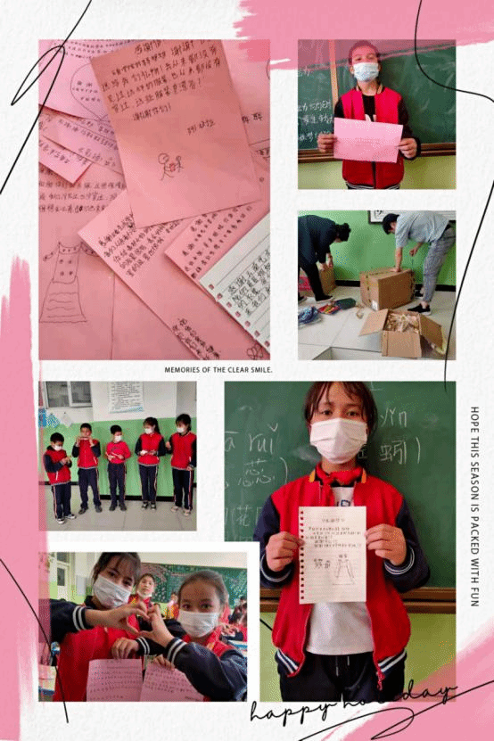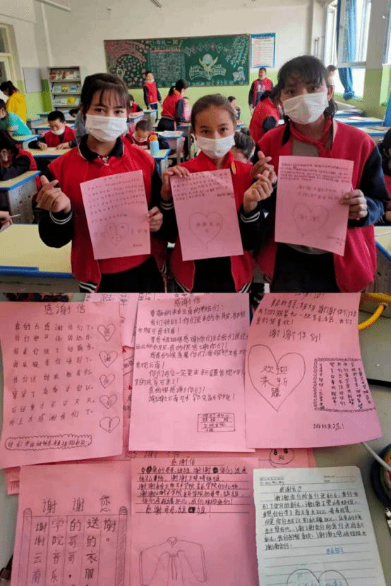捐赠的物品经过长途跋涉,终于在4月26日送到新疆省和田市某小学小朋友们的手里,小朋友非常开心,自发的写下了许多感谢信。学校的老师和小朋友们给音乐学院团委发来了照片和感谢信。