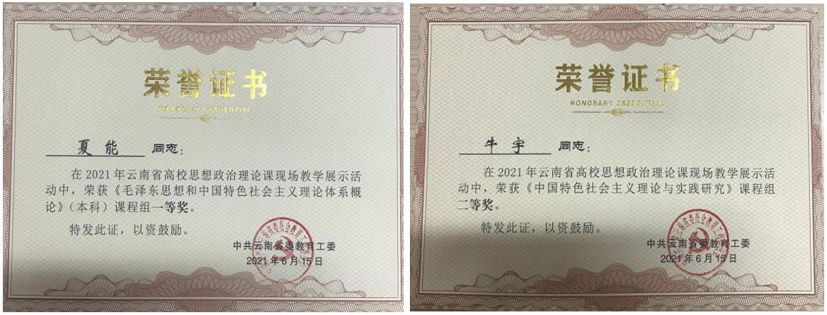 云南省82所高校选派近150名思政课教师参加现场教学展示,马克思主义学院选派2名青年教师参加现场展示。夏能老师获得《毛泽东思想和中国特色社会主义理论体系概论》课程组一等奖,牛宇老师获得《中国特色社会主义理论与实践研究》课程组二等奖。