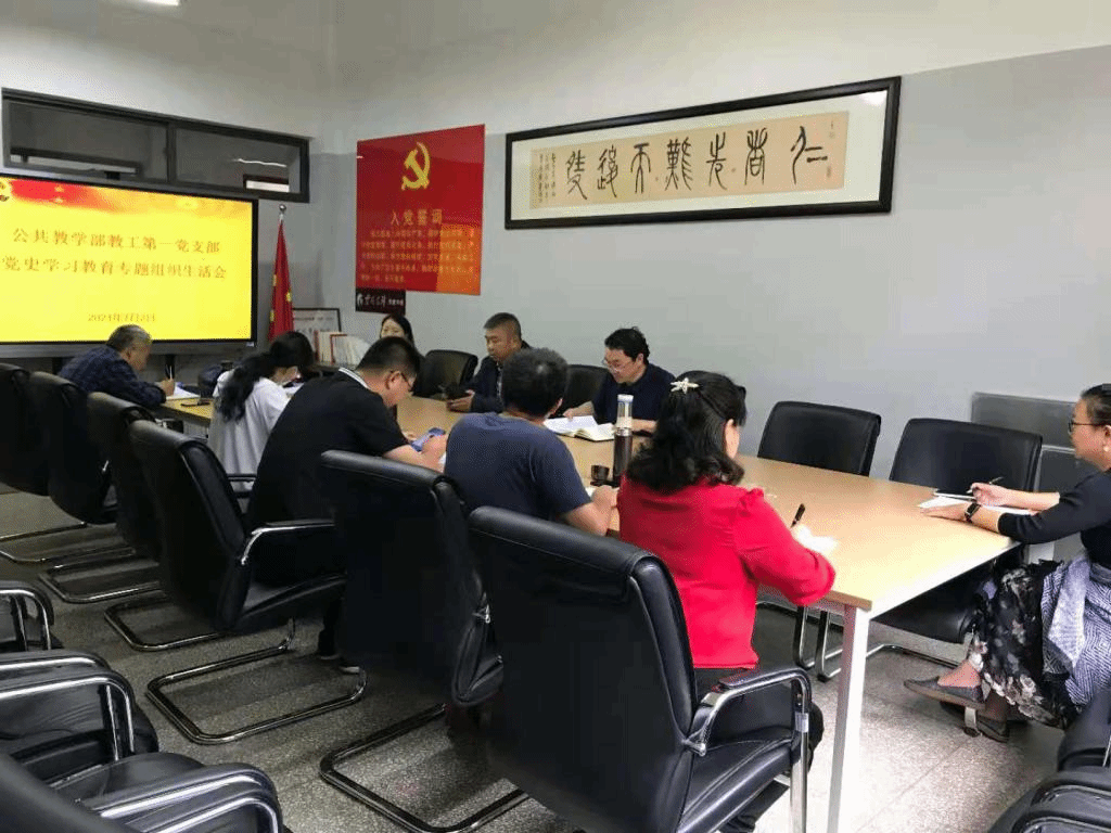 2021年7月2日上午10点,公共教学部教工第一党支部全体党员在公共教学楼B106会议室召开党史学习教育专题组织生活会。会议由支部书记史家银同志主持。公共教学部党总支书记杨祝飞同志到会指导和点评。