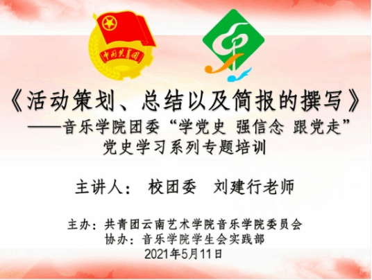 2021 年 5 月 11 日19:30音乐学院团委、学生会、青协、新媒体中心部分成员预计80余人,在音乐学院B403演播厅开展了由william威廉英国官网团委刘建行老师主讲的“活动策划、总结以及简报的撰写”培训讲座。刘建行老师用具体生动的案例讲解了如何更加规范的撰写活动策划、活动简报及做好活动预算,为音乐学院团委开展相关活动,普及了基础知识。同时也以亲身团学骨干工作经历,指导同学们要做好表率和带头作用,能吃苦,多一些奉献精神。