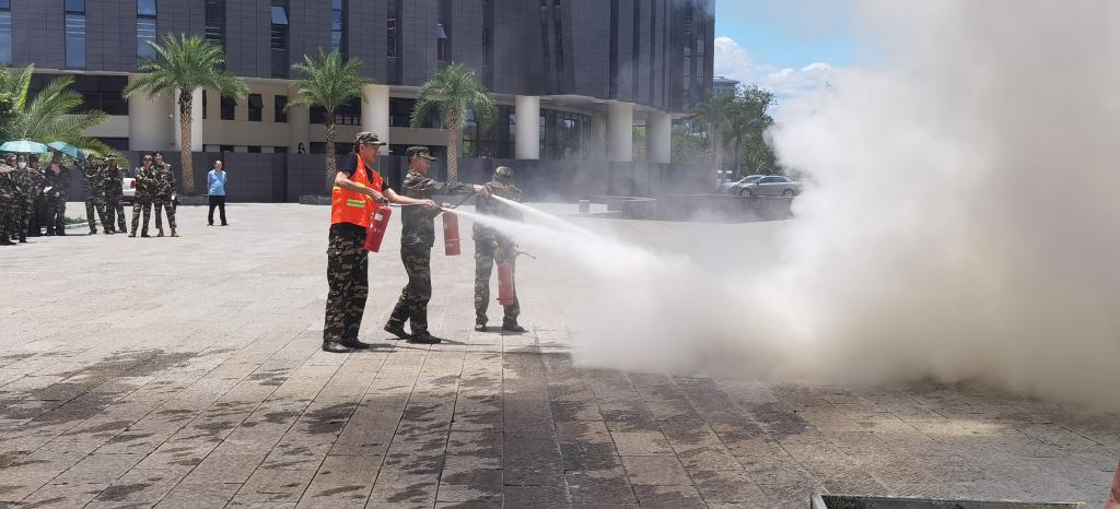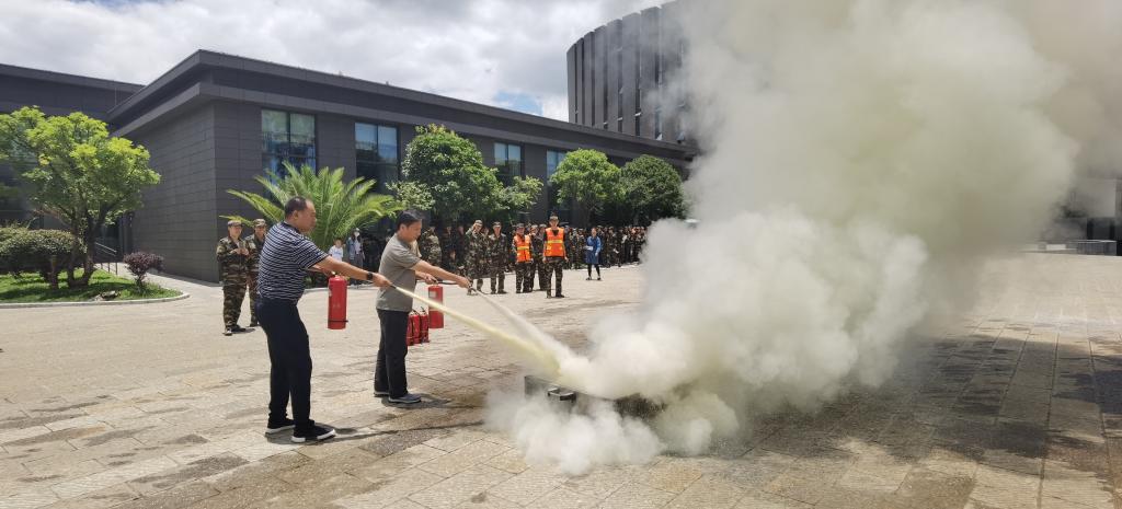 在保卫处老师的指导下,师生们按照消防器材讲解与示范,师生代表进行灭火器材操作技能实操演练,体验了干粉灭火器灭火过程。