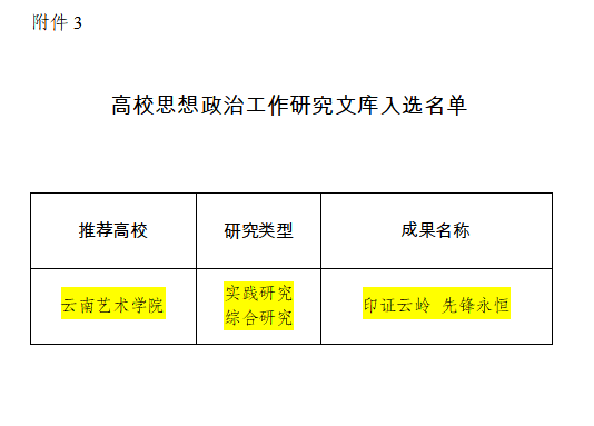 同时,我校《具有中国特色的边疆民族艺术教育课程思政育人体系的构建》、平面设计《云南生物多样性主题科普宣传插图绘本》《印证云岭 先锋永恒》3个项目分别被省委教育工委推荐申报教育部相应项目。