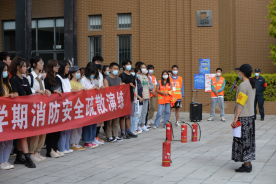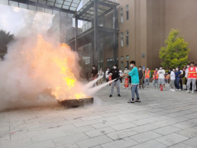培训结束后,参加演练的新生在听到警报和哨音后,从各班教室按照指定的疏散线路,有序迅速撤离教学楼,疏散到设计学院教学楼中庭小广场集合后就地解散,由各班学生干部代表继续参加灭火演练。在保卫处老师的指导下,按照消防器材讲解与示范,参加演练的教师代表和学生代表进行灭火器材操作技能实作演练,实操学习了干粉灭火器的使用。