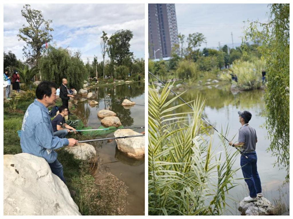 到了垂钓点,各个老师调试渔具,打窝下钓钩,动作娴熟。随着比赛不断进行,原本风平浪静的水面泛起无数水花,线组划破空气的声音此起彼伏,鱼儿不断扑棱出水面,现场惊呼连连!