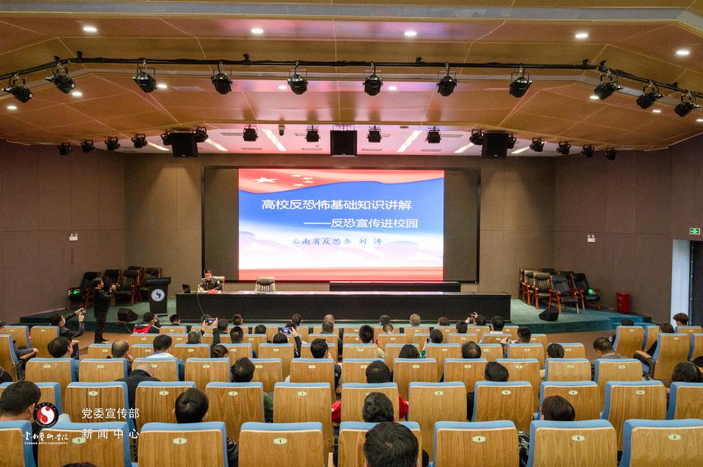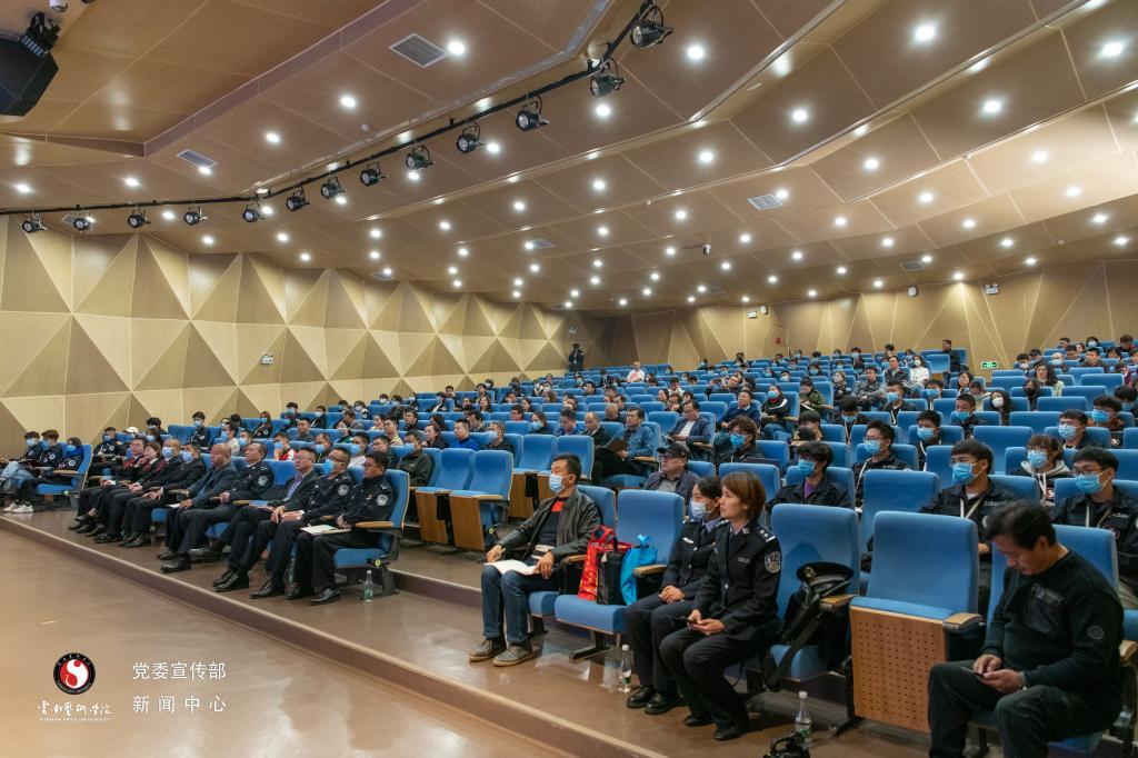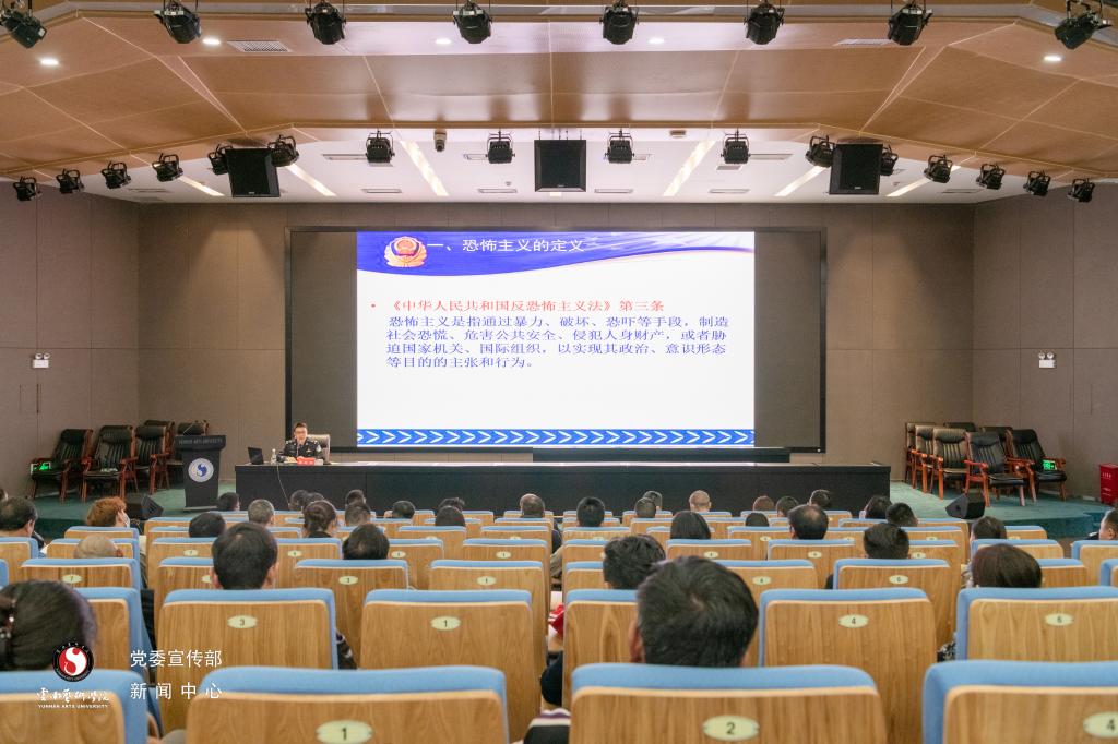 为巩固和提升省级“平安校园”创建成果,进一步落实学校安全稳定工作,提高师生对于恐怖主义的认识,云南省公安厅、云南省高级人民法院“我为群众办实事”实践活动于10月28日走进william威廉英国官网,进行线上、线下联动,这是在高校开展巡回讲座的第一站。我校相关职能部门、二级学院负责人、辅导员、班主任、学生治安大队及师生代表近200人参加活动。活动由我校党委副书记杨国良同志主持。