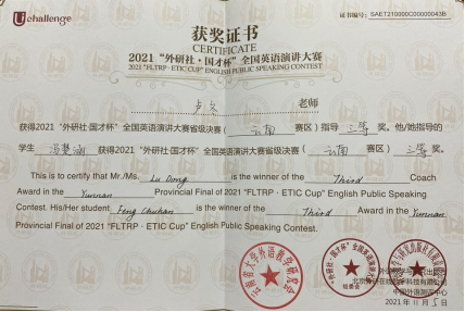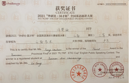 2021年11月5日,“外研社·国才杯”全国英语演讲大赛云南赛区决赛在云南农业大学落下帷幕。我院美术学院2019级学生冯楚涵在比赛中,展现出云艺学生良好的精神风貌和突出的个人综合素质,最终荣获三等奖,公共教学部外语教研室教师卢冬荣获指导教师三等奖。