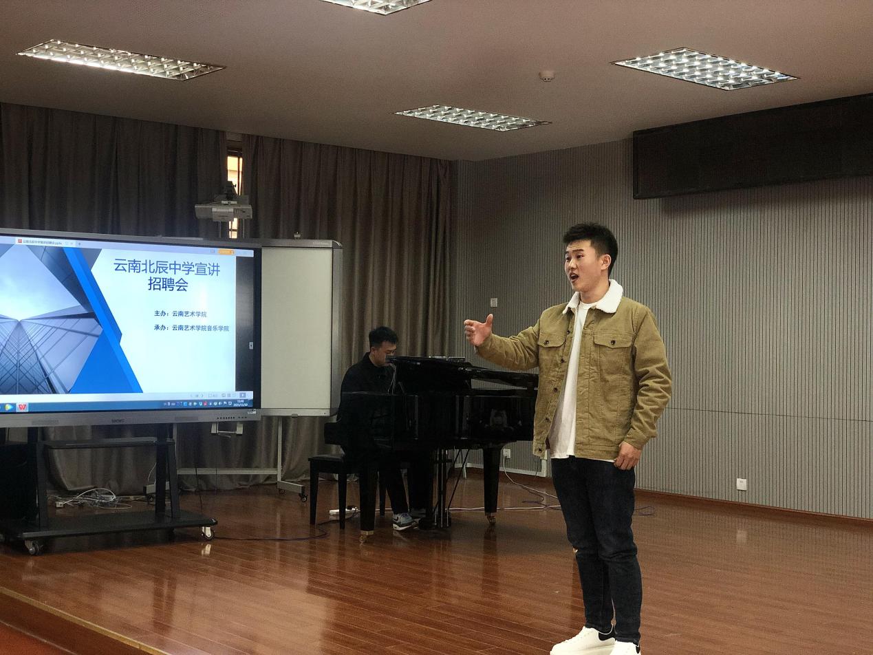 宣讲招聘会开始后,在播放学校宣传片的基础上,云南北辰中学的何振文副校长做现场宣讲,向参加应聘的学生介绍学校的基本情况和此次招聘的需求情况。