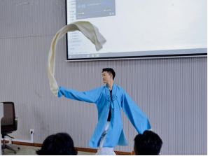 冯咏梅老师首先向教师同学们介绍了滇剧的历史渊源,提出滇剧的最大特点是声腔,滇剧的三大声腔分为:丝弦、襄阳、胡琴。从不同声腔的特色入手,通过自己的作品,冯老师对声腔进行了生动详细的讲解。“滇剧表演”的内容重点在于对戏曲表演四功五法的阐述。除了自己展示之外,冯咏梅老师团队的两位青年戏曲演员为广大师生们进行了女娃娃生技巧及男旦水袖的现场演示。精彩生动的展示,深得师生们的喜爱,台下掌声连连。代表剧目部分,冯咏梅老师就“新滇剧”的创作理念展开讲述。以《水莽草》《贵妇还乡》与《马克白夫人》为例,她强调玉滇探索的新滇剧,是传承式发展,是“在继承传统的基础上,从时代内涵、音乐、声腔、表演、人物造型、舞台美学等全方位进行创新创造,这既是滇剧,又不是老滇剧,但一定是滇剧。”最后一个部分,冯咏梅老师就艺术应有的现代品格进行延伸思考,她认为现代戏曲作品必须具有现代意识、较高的文学性及审美价值,并且从自己的演艺经验出发提出了有关戏曲传承发展的几点建议。