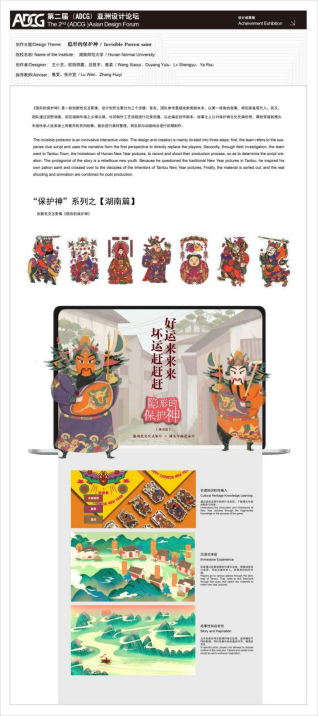 湖南师范大学美术学院团队作品名为“隐形的保护神”,是一款创新交互影像。本作品将实拍与动画结合进行后期制作,从云南的“我心中的保护神”到湖南的“隐形的保护神”,保护神文化存在于各个地方,等待着我们去挖掘与探寻。该团队还会继续进行各地保护神的调研与数字化展示,不断丰富保护神在虚拟世界中的形态。