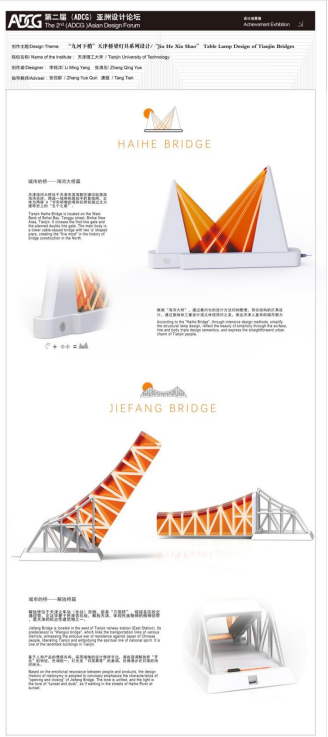 天津理工大学团队,作品“九河下梢”天津桥梁灯具系列,以探索本土文化基因为核心,将人类生活志、文化分析和符号分析与设计等,创造性地应用于消费者洞察和产品设计中,通过实地考察天津桥梁,提取桥梁特征可设计元素,从实用功能与产品理念出发,运用系统设计、三维构成等设计理论完成具有人情味与时代特性并存的理论体系与实践方案,探索天津海河桥梁文化带的最新传播策略,使“桥文化”活态化,实现可视、可感、可触,以一种全新的方式将桥梁文化呈现在大众眼前。