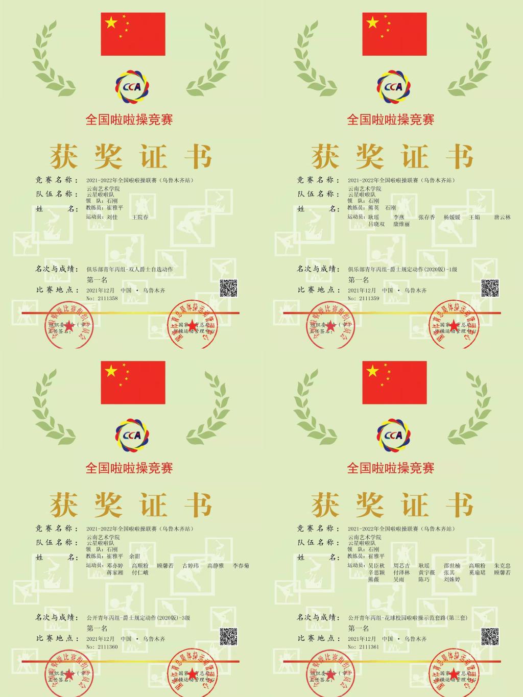 由国家体育总局体操管理中心、中国蹦床与技巧协会主办的2021-2022年全国啦啦操联赛(乌鲁木齐站)于12月4-5日在新疆维吾尔自治区乌鲁木齐市举行,在学校领导的关心和支持下,体育教学部组队参加此次比赛,我校啦啦操队在本次比赛中努力拼搏,争创佳绩,展示了云艺学子的风采,共获俱乐部青年丙组双人爵士自选动作、俱乐部青年丙组爵士规定动作(2020版)1级、公开青年组丙组爵士规定动作(2020版)3级、公开青年丙组花球校园啦啦操示范套路(第三套)四项第一名的好成绩。
