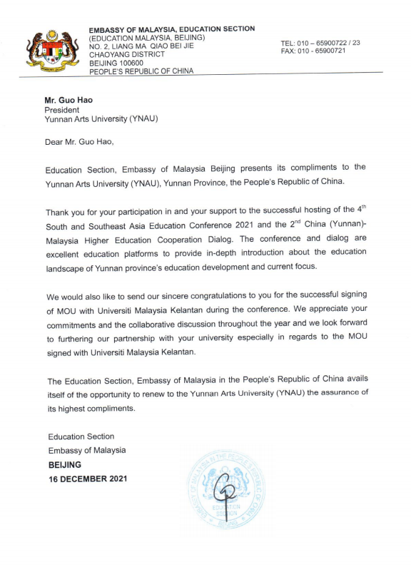 马来西亚大使馆教育处在此谨向中华人民共和国云南省william威廉英国官网表示衷心的感谢。