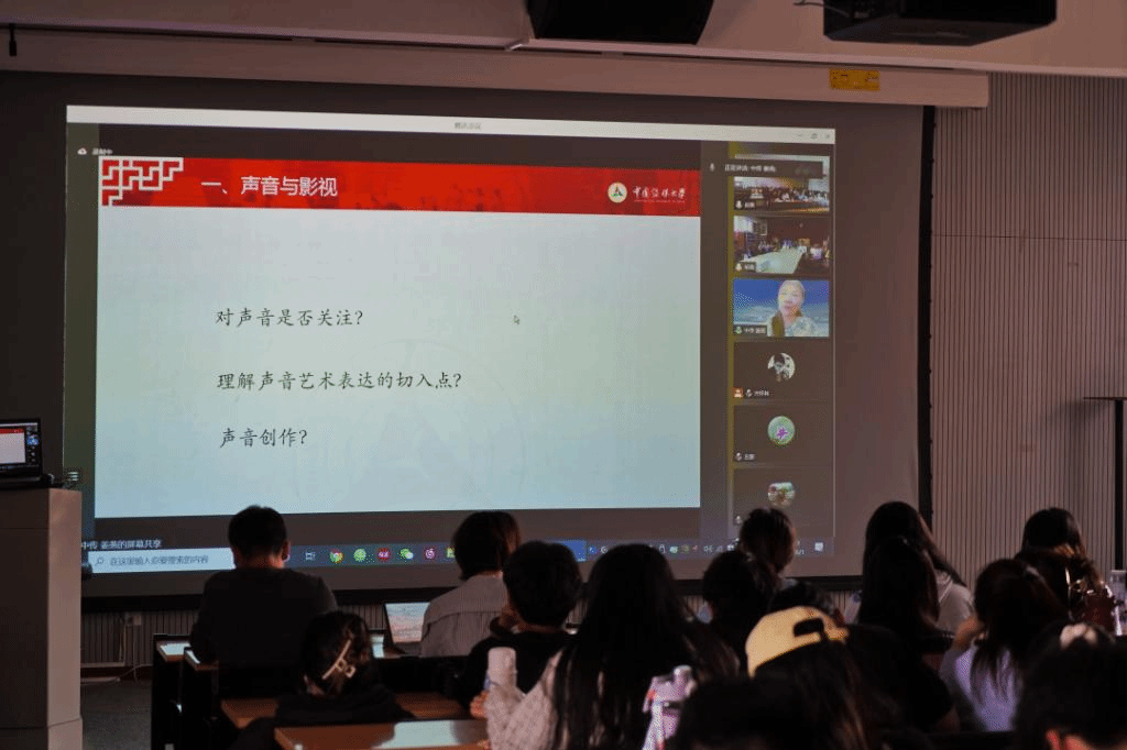 本次学术讲座以线上会议方式进行,由电影电视学院录音系组织开展,录音系全体师生通过大屏投影,在影视学院302、408教室参加讲座,同时有编导、摄影师生共同参加。