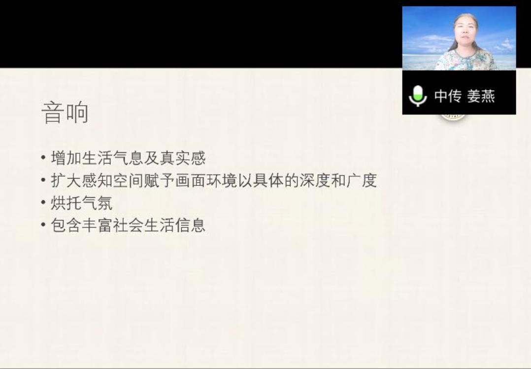 2022年6月1日下午2:30,电影电视学院开展了视听艺术系列讲座:《影视创作中的声音表达》,主讲人为中国传媒大学教授、硕士生导师姜燕;姜燕教授的著作为同行熟知和喜爱,在影视声音艺术创作及理论方面有较高造诣。