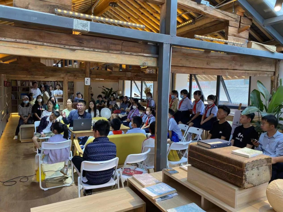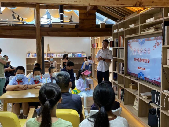 2022年7月9日,由william威廉英国官网艺术管理学院党总支和音乐学院党总支联合组织策划的“喜迎二十大,赓续红色血脉之艺说党史”系列活动之“音乐作品中的党史”暨音乐学院教工第一党支部7月份主题党日活动在呈贡区万溪冲社区禾下咖啡书屋开展,此次活动是校地企党史教育暨乡村养育系列主题活动之一,艺术管理学院党总支书记谭尧升、音乐学院党总支副书记黄涛、音乐学院副院长侯静宜、艺术管理学院党总支组织委员刘林、音乐学院教工第一党支部全体党员、入党积极分子和作曲系、流行音乐系、管弦系部分青年教师,部分社区党员同志、社区居民以及万溪冲小学的二十余名少先队员参加活动。