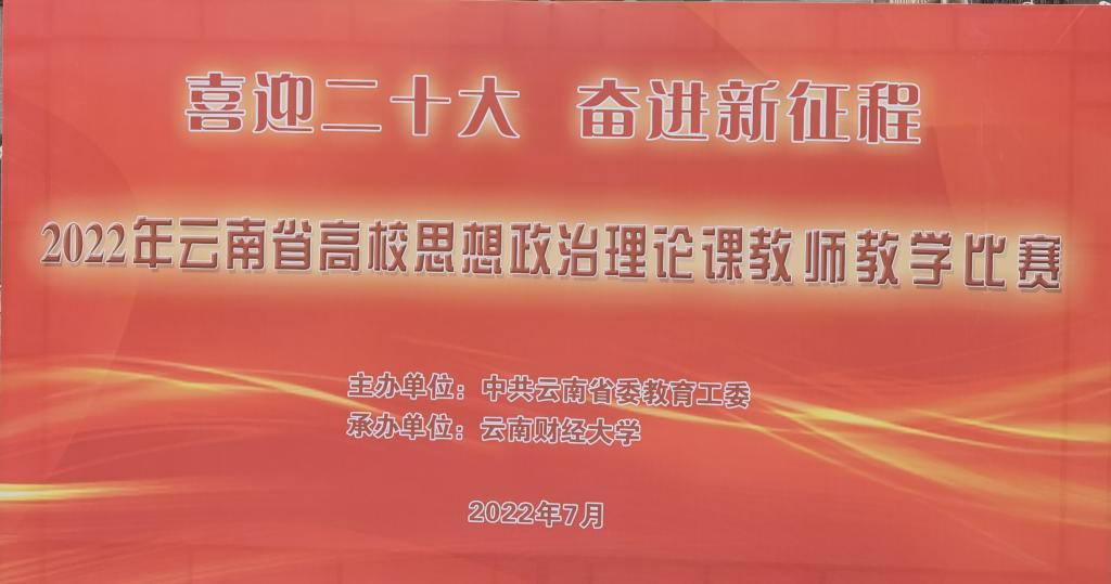 为深入学习宣传贯彻习近平新时代中国特色社会主义思想和党的十九大及十九届历次全会精神,在中国共产党成立101周年之际,2022年7月7日至10日,由中共云南省委教育工委主办、云南财经大学承办的2022年云南省高校思想政治理论课教师教学比赛在云南财经大学龙泉校区顺利进行。