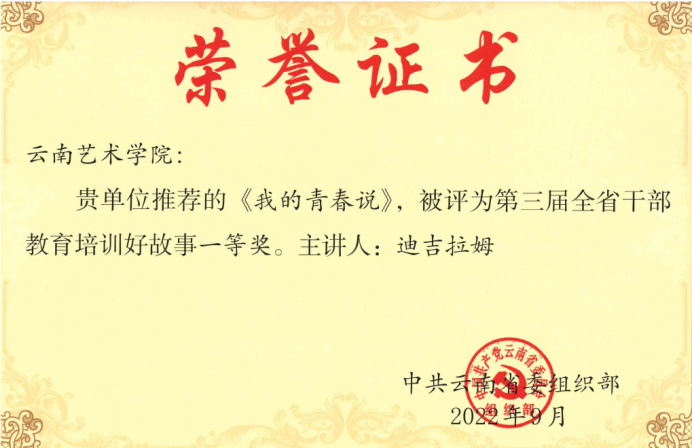 在第三届全省干部教育培训好课程、好案例、好故事推荐评审中,我校迪吉拉姆同学主讲的好故事《我的青春说》在众多作品中脱颖而出,作为唯一的在校大学生参赛获得了一等奖。