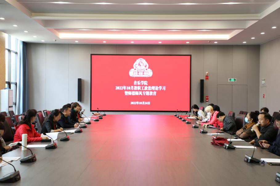 2022年10月24日,音乐学院党总支组织开展了2022年10月教职工政治理论学习暨师德师风专题教育。本次学习采用集中学习和分组学习相结合,全院教职员工围绕党的二十大报告、网络文明和师德师风建设三个专题展开学习。下午13:30在图书馆会议室,音乐学院党政领导班子、全体硕士研究生导师60余人参加集中学习。