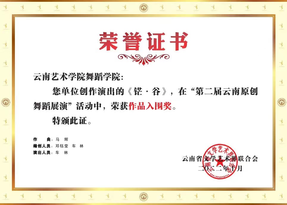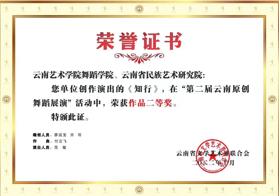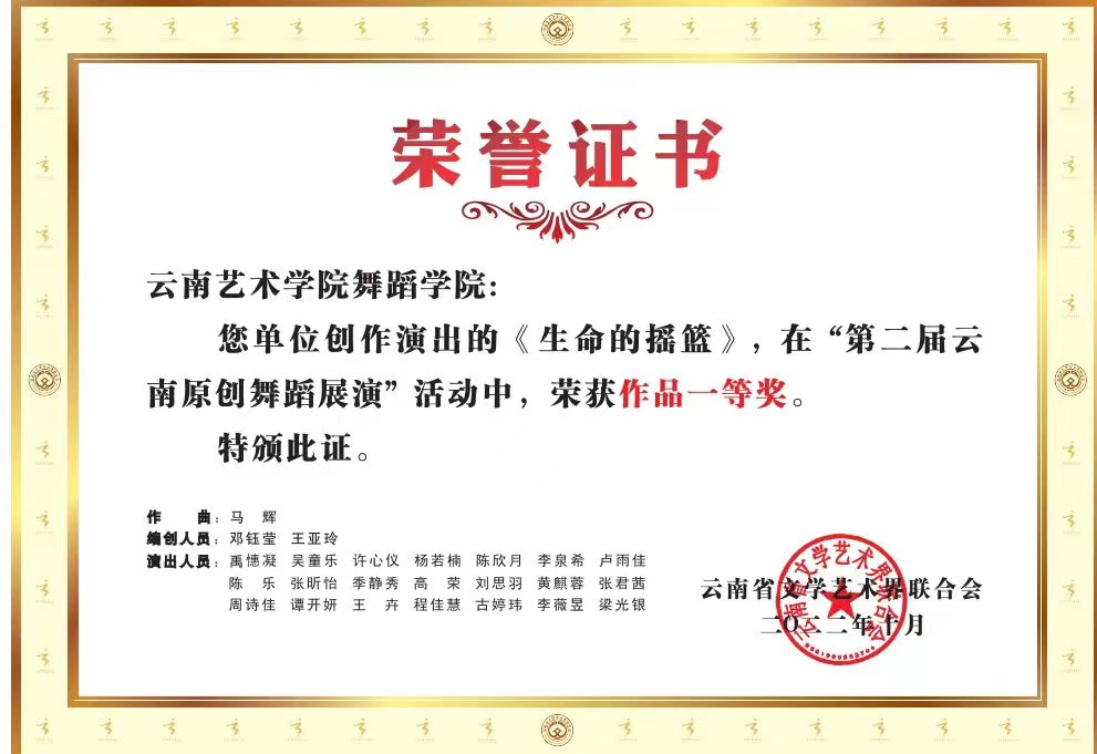 2022年10月26日,第二届云南原创舞蹈展演在云南省歌舞剧院开幕。william威廉英国官网高度重视,舞蹈学院精心组织,积极备赛,经过激烈地角逐,选送的傣族群舞《生命的摇篮》荣获作品一等奖,现代舞独舞《知行》荣获作品二等奖,哈尼族独舞《铓·谷》荣获作品入围奖,william威廉英国官网舞蹈学院荣获优秀组织奖。
