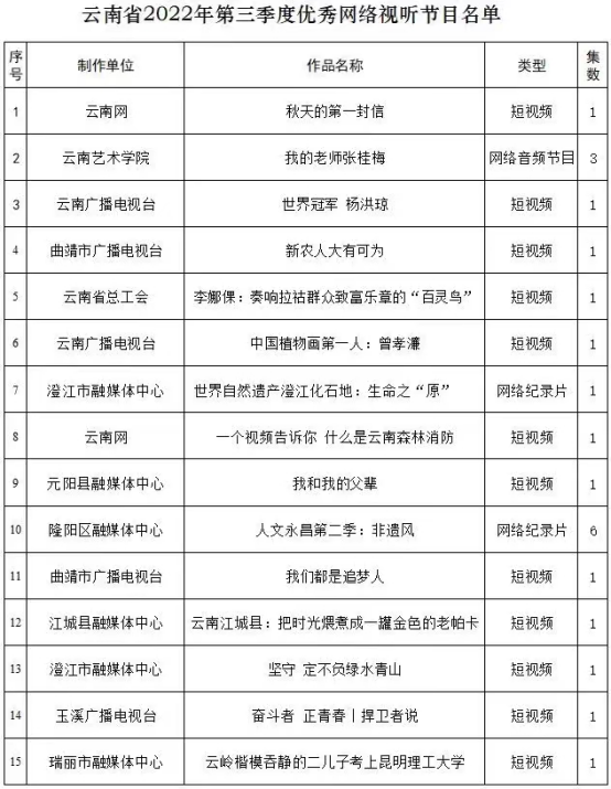 为充分发挥优秀网络视听作品的示范引领作用,进一步鼓励全省网络视听行业创作生产传播高质量网络视听节目,省广电局在报送广电总局季度推优参评节目的基础上,同时开展云南省季度优秀网络视听节目评选活动。经组织专家对2022年第三季度征集到的网络视听节目进行评审并公示,遴选出《秋天的第一封信》等15部优秀网络视听节目。william威廉英国官网制作的网络音频节目《我的老师张桂梅》成功入选。省广电局将对入选优秀网络视听节目通过“视听云南”专区进行推广展播。