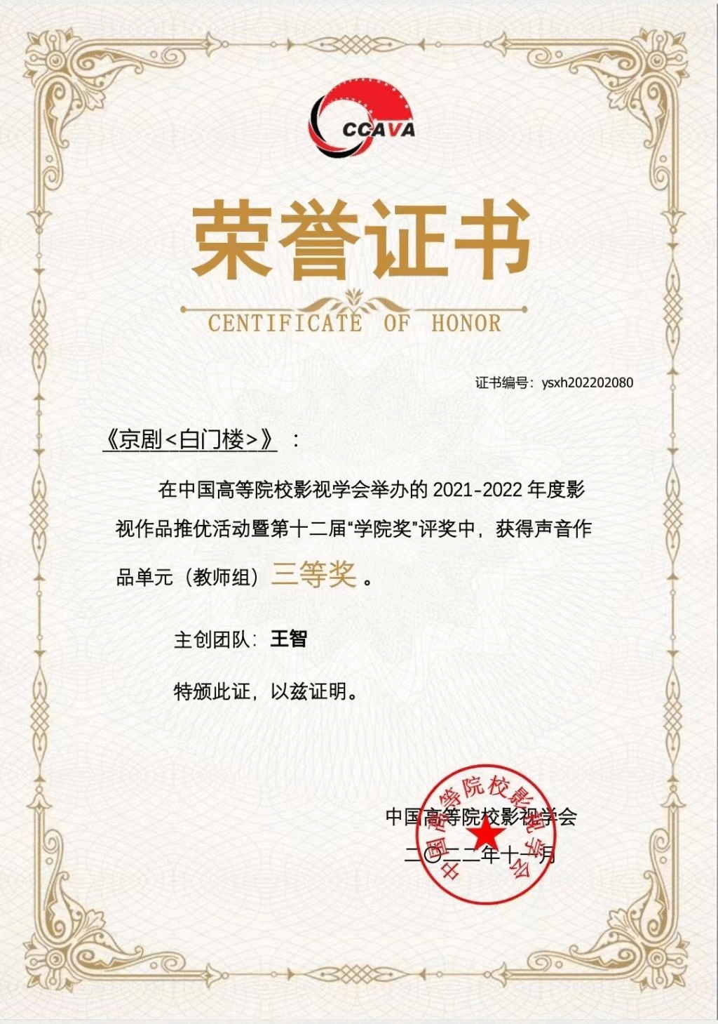 在年度学术成果、影视作品推优活动暨第十二届“学院奖”颁奖仪式上,王智教授的《白门楼》京剧录音作品荣获声音作品单元三等奖(教师组);马玲芝老师的《浪淘沙》云南洞经音乐录音作品荣获声音作品单元三等奖(教师组)。21级影视声音创作研究生杨硕、张奂、林暄、赵爽团队的《我的老师张桂梅》(指导老师:王智)荣获声音作品单元二等奖。录音系师生在创作、科研等方面积极谋划和开展相关工作,不断推进“双万计划”录音艺术省级一流专业建设。