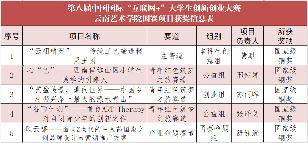 日前,教育部发布了《关于公示第八届中国国际“互联网+”大学生创新创业大赛总决赛有关赛事获奖名单的通知》,我校“云栩精灵——传统工艺缔造精灵王国”等5个创新创业项目获得国家级铜奖,其中,包括高校主赛道1个项目、青年红色筑梦之旅赛道3个项目、产业命题赛道1个项目。同时学校也是首次有创新创业项目进入产业命题赛道总决赛。